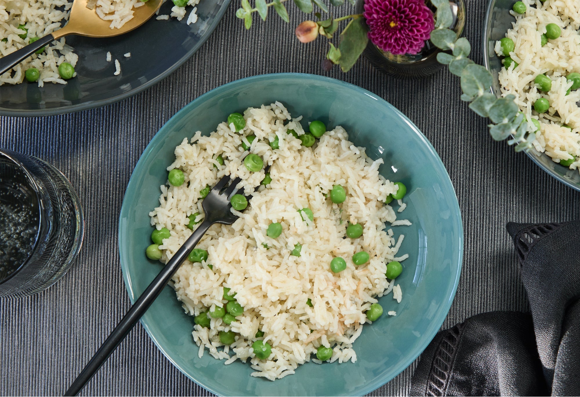 Remove from the heat, uncover, and add the peas if using. Lay a folded, clean kitchen towel over the pan and cover with the pan’s lid to hold the towel in place. Let the rice rest for 10 to 12 minutes. Remove the lid, fluff with a fork, and serve.