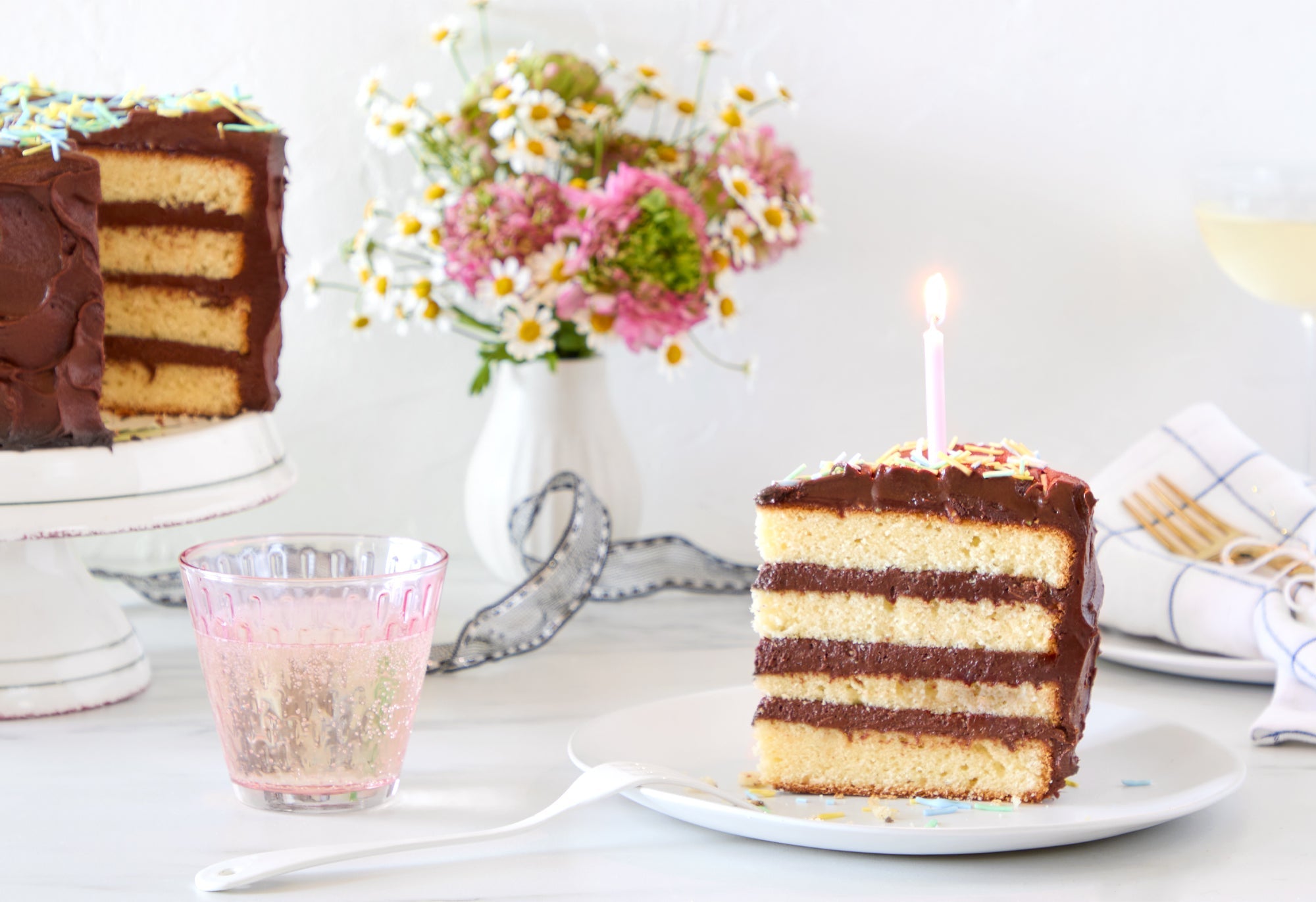 Spread the remaining frosting over the top and sides of the cake, using a spatula to form a smooth coat or decorative swoops and swirls, as you prefer. Garnish with sprinkles, sparklers, and candles.