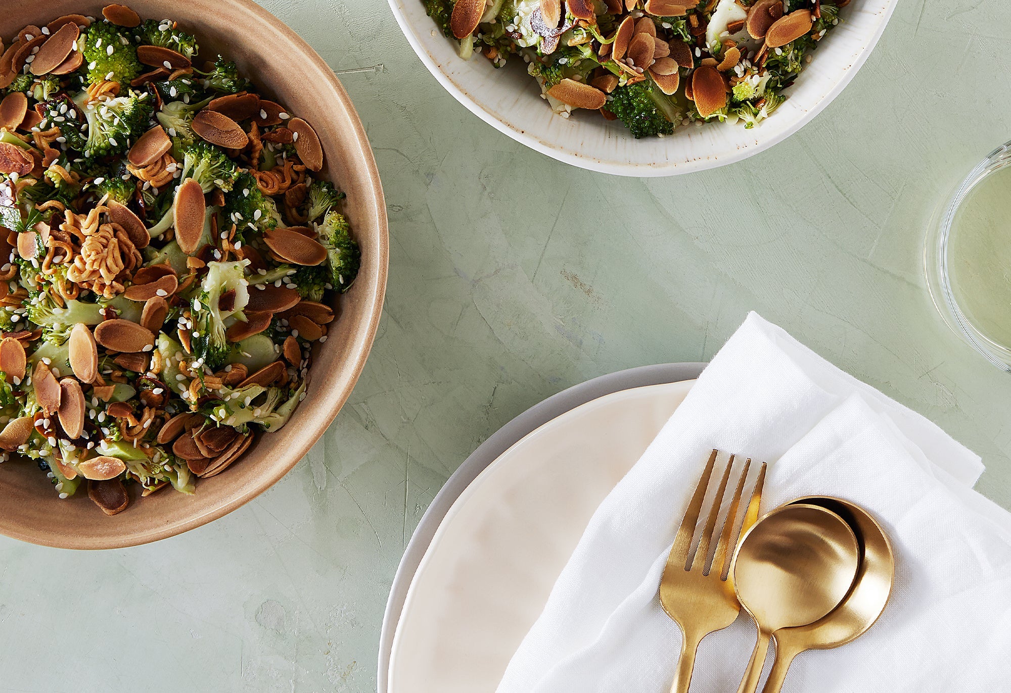 Heat the oven to 350°F, and position a rack in the middle of the oven. Spread out the crushed ramen noodles and sliced almonds on a lined baking sheet. Toast until fragrant and golden brown, about 10 to 15 minutes, stirring once halfway through.