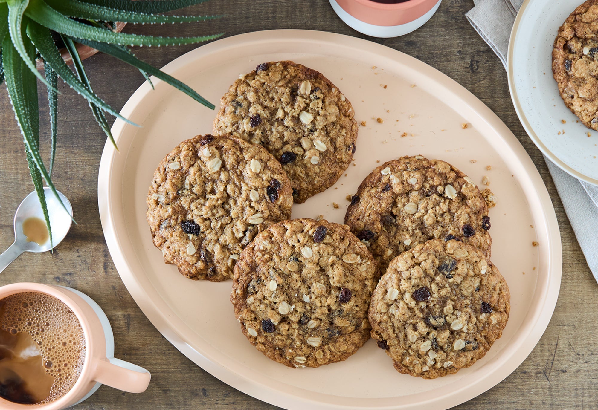 With the mixer running on low, slowly add the flour mixture in 3 additions. Mix in each addition just enough to combine, and scrape down the sides of the mixing bowl with a rubber spatula between each addition. Add the oats and raisins and mix on low just to combine.