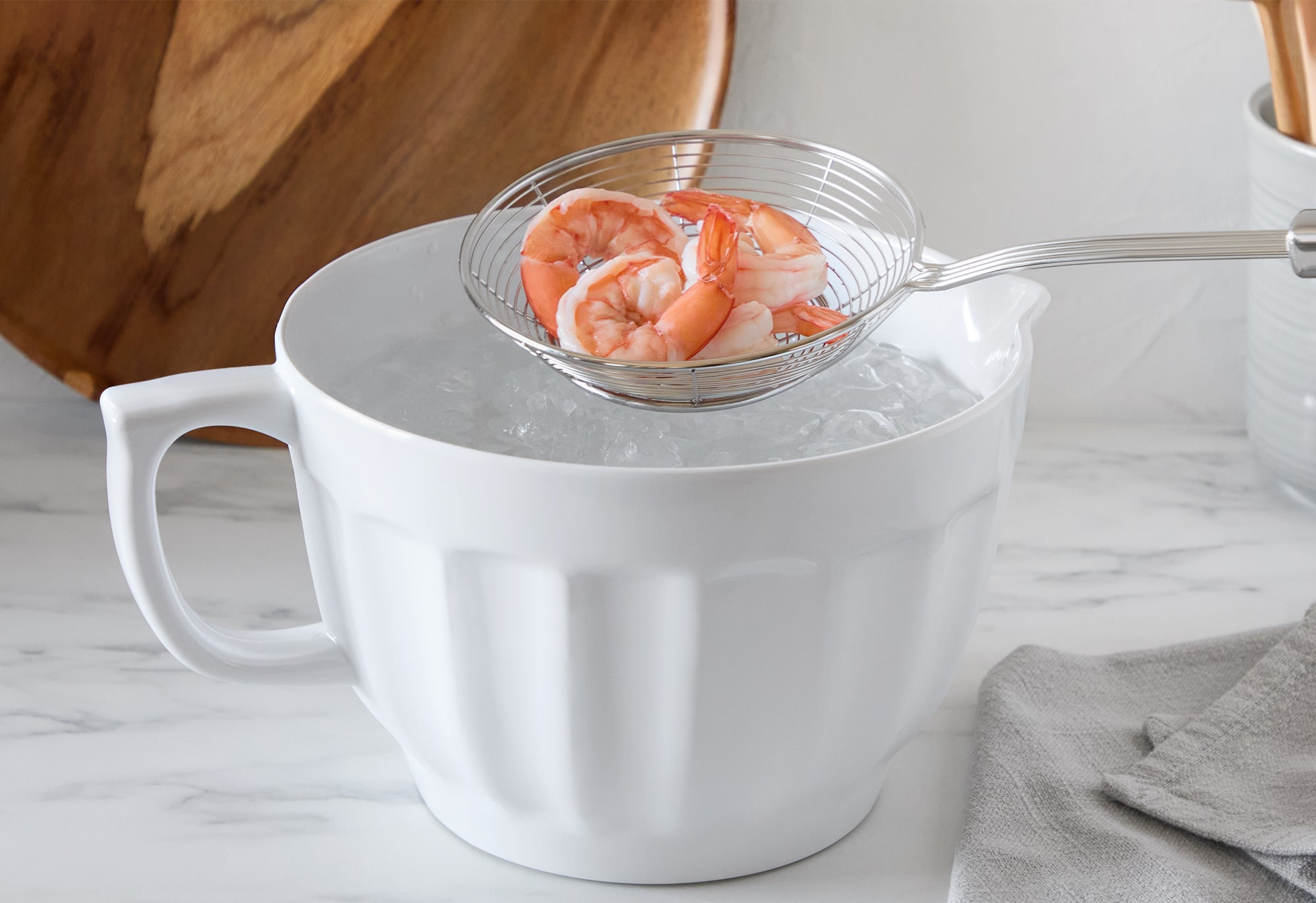 When an ingredient is cooked to the degree of doneness you desire, remove it from the pot with a slotted spoon or spider strainer, transfer to your ice bath, and stir. Then scoop the cooled ingredients into a clean dish and continue with your recipe.