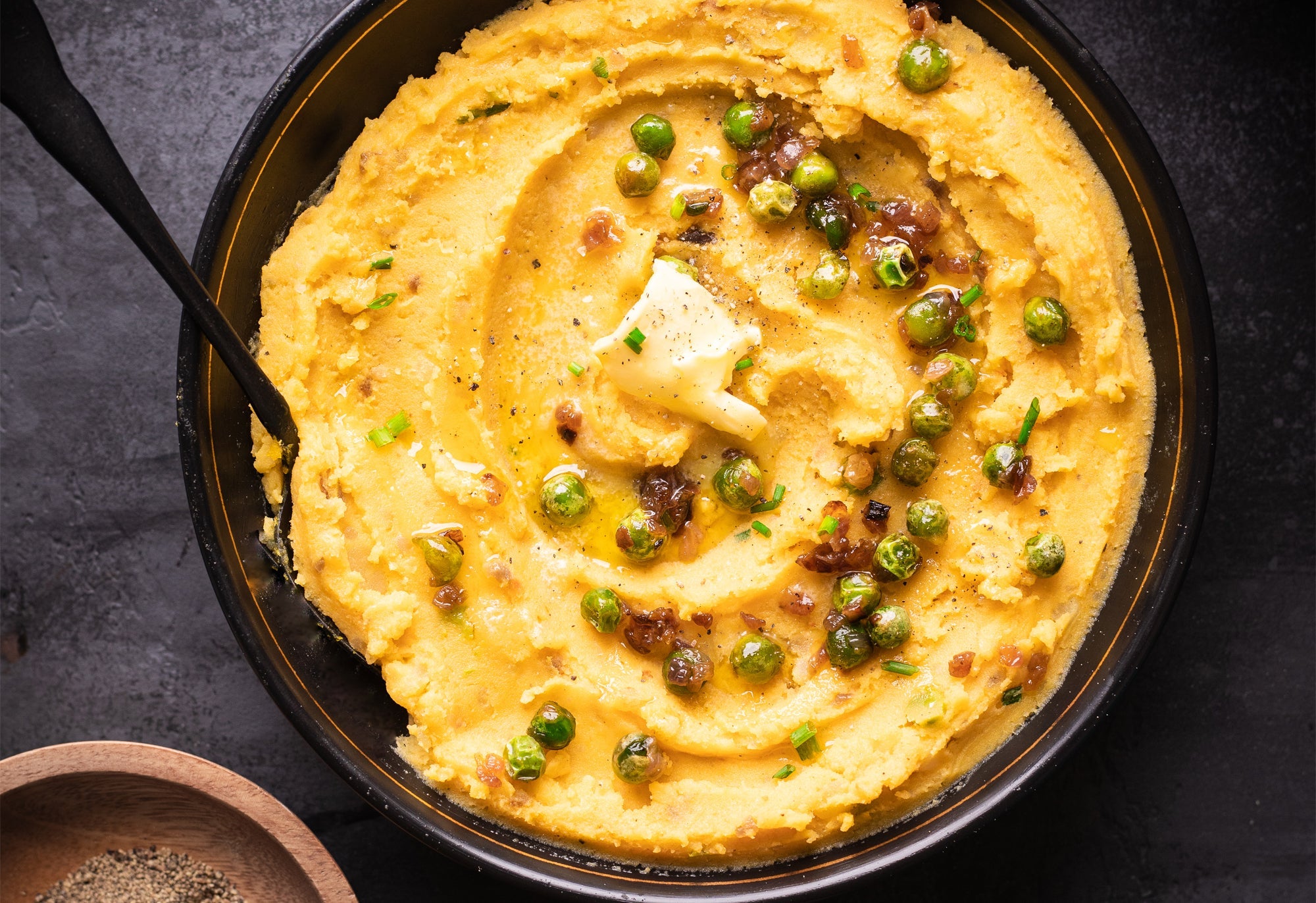 Rich, creamy mashed potatoes get a boost of flavor, color, and nutrients with the addition of winter squash puree. Topped with luscious caramelized onions and juicy green peas, this comforting side becomes the star of the show.