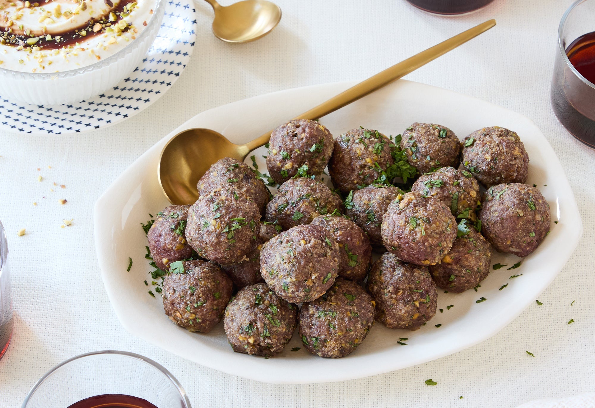 Make the yogurt sauce. Whisk together the yogurt, lemon juice, oil, cumin, coriander, ½ tsp salt, and a few grinds of black pepper. Refrigerate, covered, to allow the flavors to blend while you make the meatballs. Just before serving, adjust the sauce’s seasoning with salt, if necessary. Transfer the sauce to a serving bowl, drizzle with the pomegranate molasses, top with the pistachios, and serve with the meatballs.