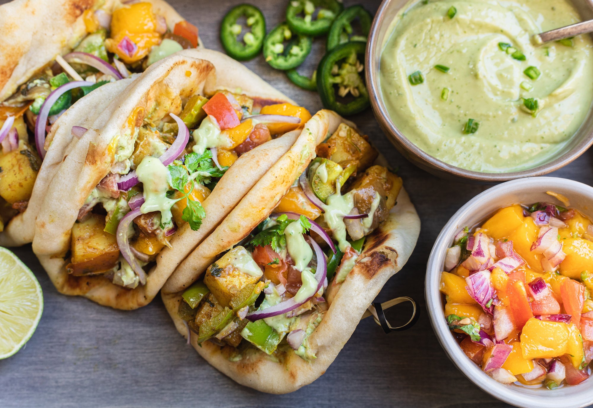 Heat a cast iron skillet over medium heat until hot. Add a teaspoon of oil to the skillet, and swirl the pan to spread it evenly over the surface. Heat the naan in the pan until warmed, softened, and a little bit toasted, about 1 minute on each side. Scoop a few tablespoons of the paneer mixture into each toasted Naan. Serve immediately, topped with the mango salsa and avocado crema.