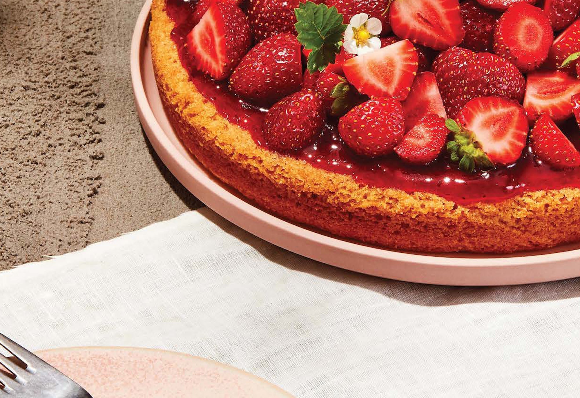 Transfer the cake to a serving platter. Be careful, because the underside may want to stick to the cooling rack. (It’s a sign of how delicious the cake will be.) Spread the jam over the top of the cake, leaving about a 1/2-inch border around the edges, and then pile high with strawberries. Try not to dig in before your guests arrive.