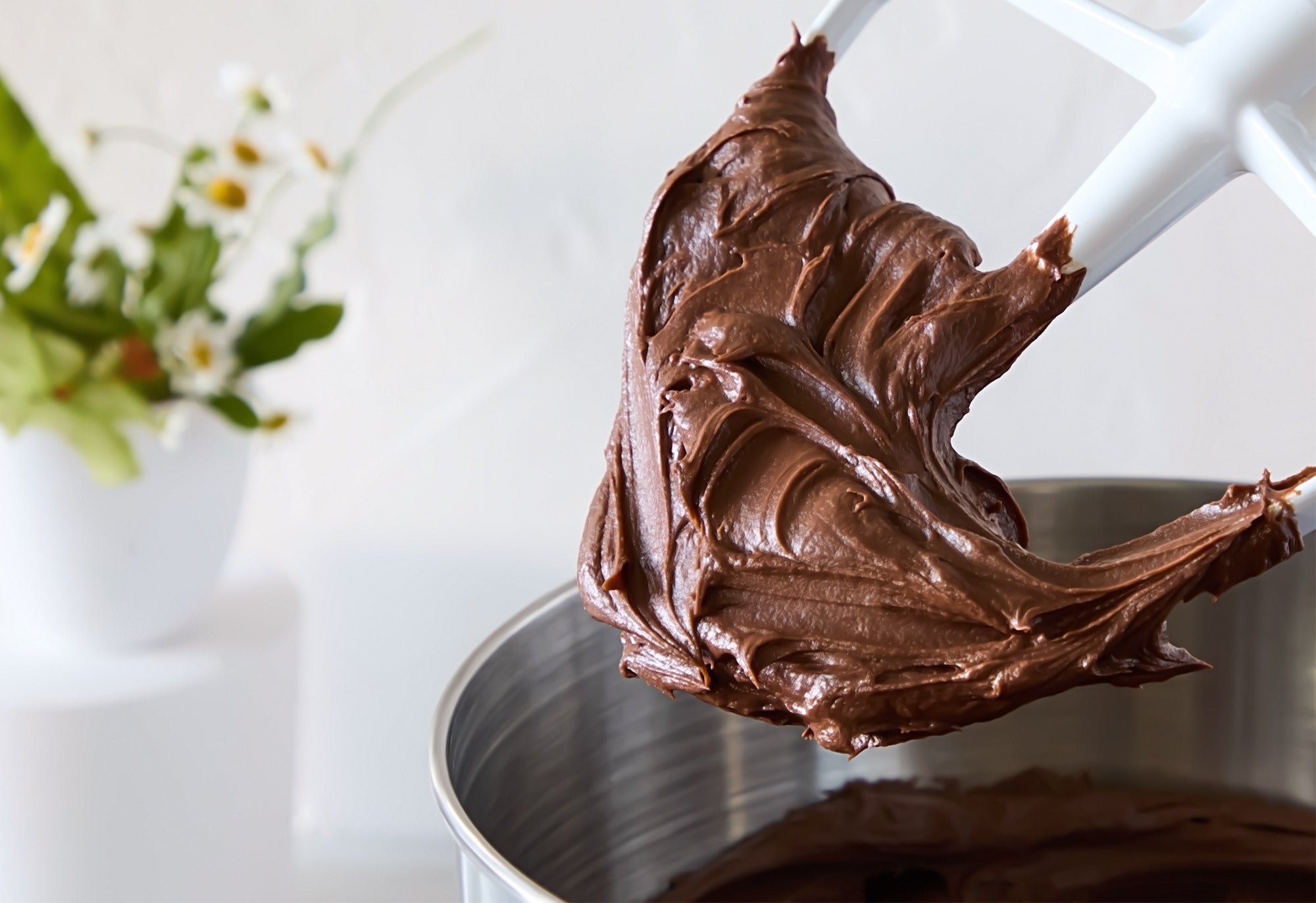 Reduce the speed to low and slowly stream in the melted and cooled chocolate. Then, increase the mixer speed to high and beat until smooth.