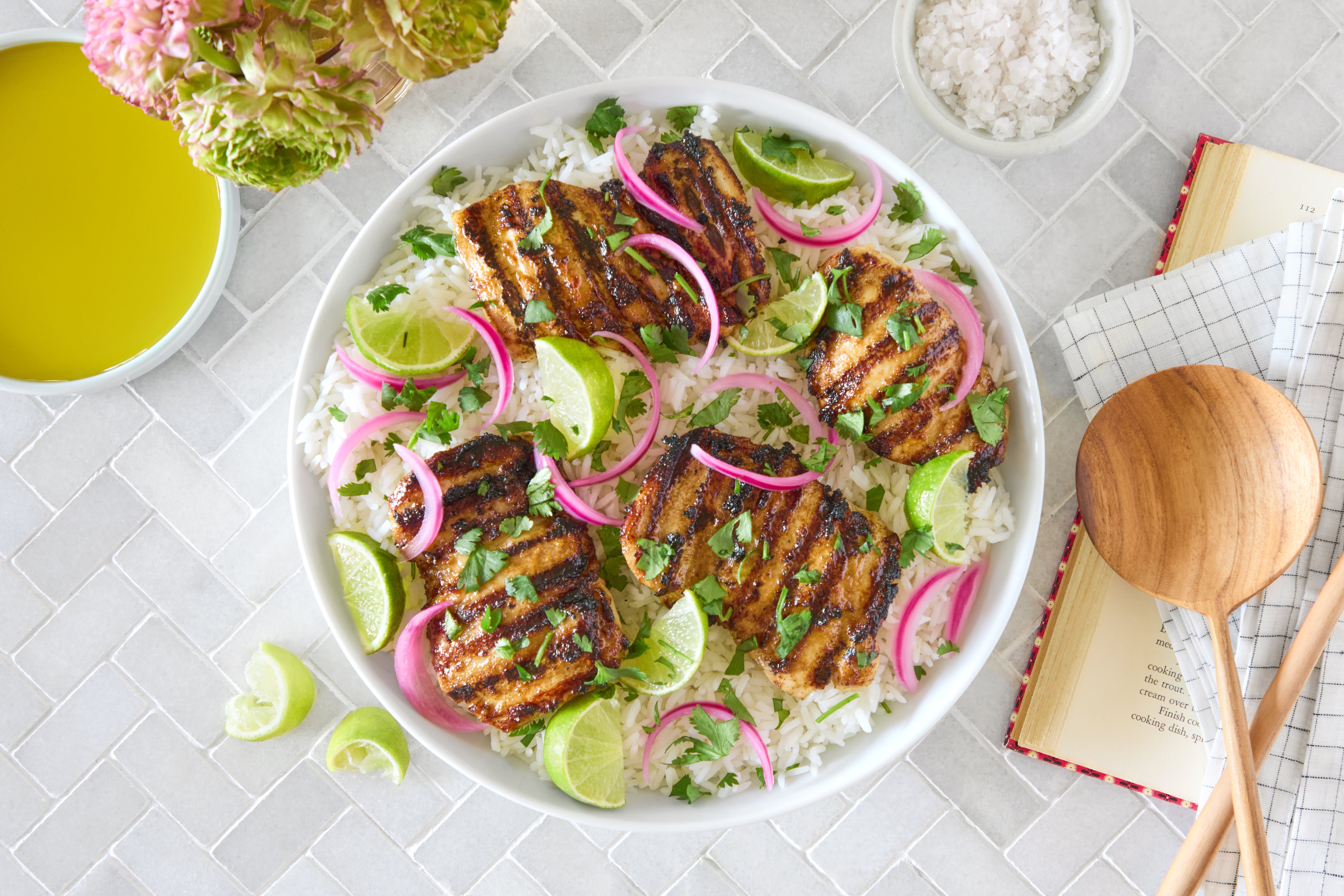 Remove to a platter and let the chicken rest for about 10 minutes. Serve on a bed of jasmine rice with some of the reserved sauce, a sprinkling of cilantro, and lime wedges for squeezing.