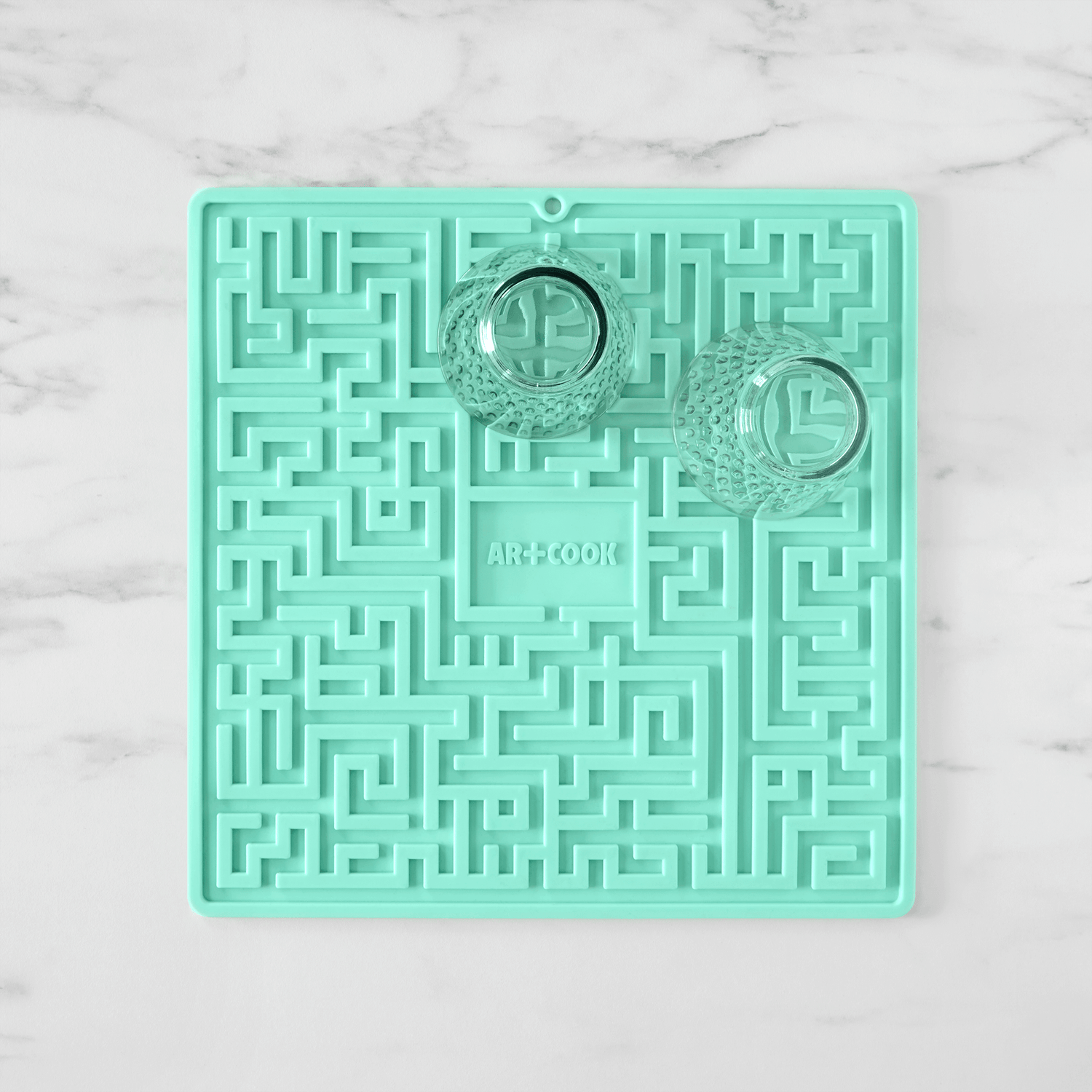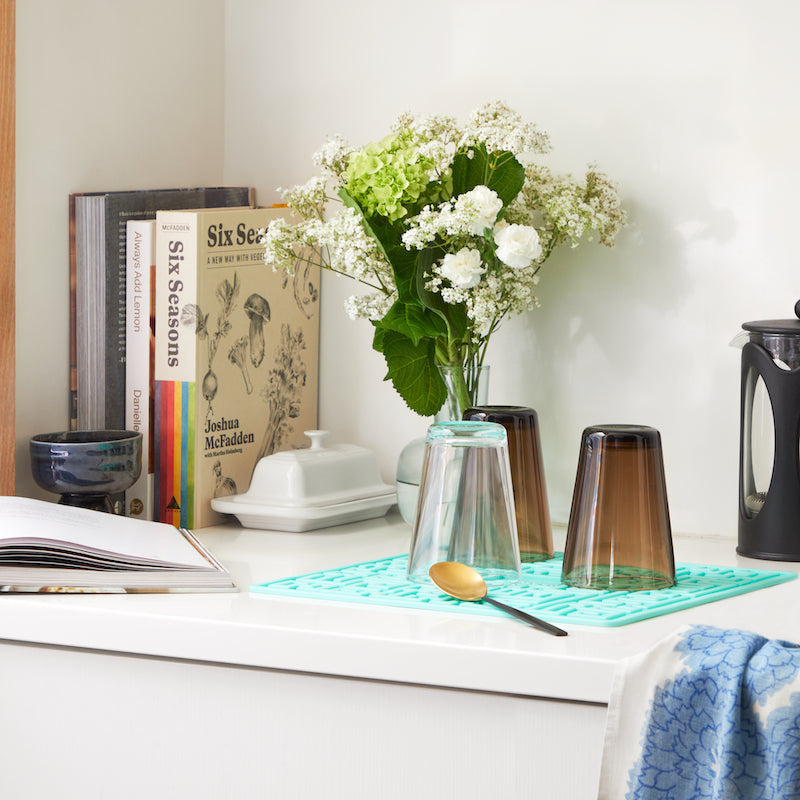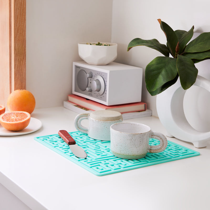 Our Maze Silicone Drying Mat is designed to keep your glasses, dishes, pots and pans elevated while drying for maximum drainage and air circulation. The non-slip grip surface protects delicate items. This Maze Silicone Drying Mat is also great to use as a trivet for hot pots and pans. The flexible silicone can be rolled up or hung for compact storage.