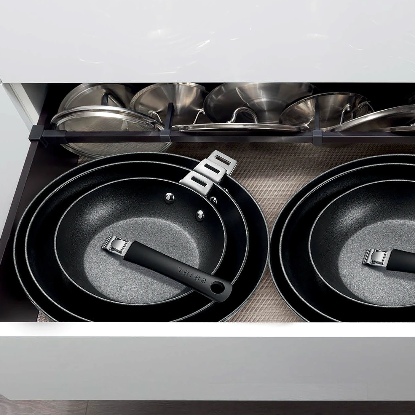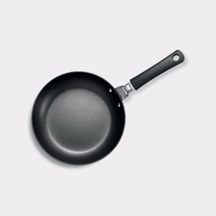 Save money, save time, save space with the Versa Anodized Fry Pan. The Versa fry pan features a detachable handle, allowing for added space on the stove, in the oven, or on the table as a serving dish. The Versa handle's easy release button allows for nested storage and easily clicks in for a secure lock. Pan without handle is oven safe to 450 F. Pan with handle is oven safe to 350 F. 3.2 mm thick hard anodized aluminum for even heating and no hot spots. Nonstick interior coating. Perfectly weighted. Detachable handles made of Bakelite and nickel-plated steel. Available in three convenient sizes and colors. Handles are interchangeable to use on any size pans.