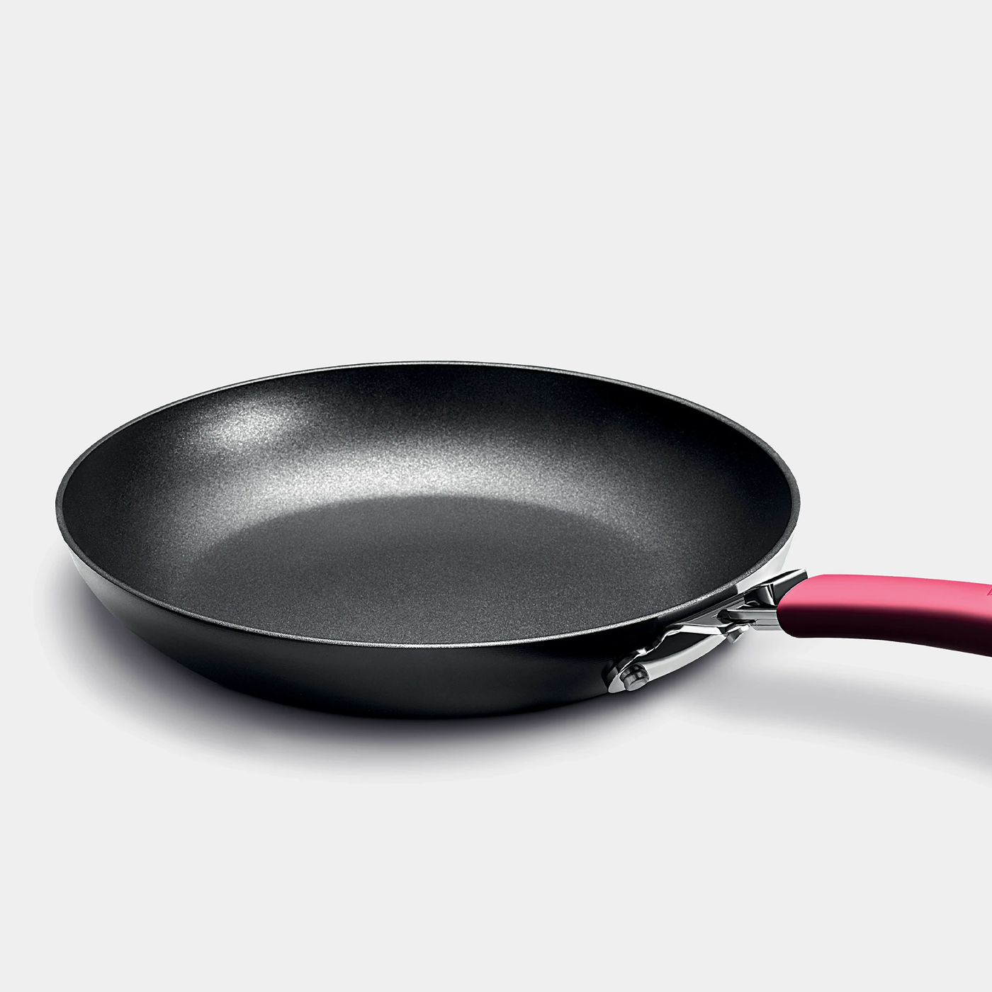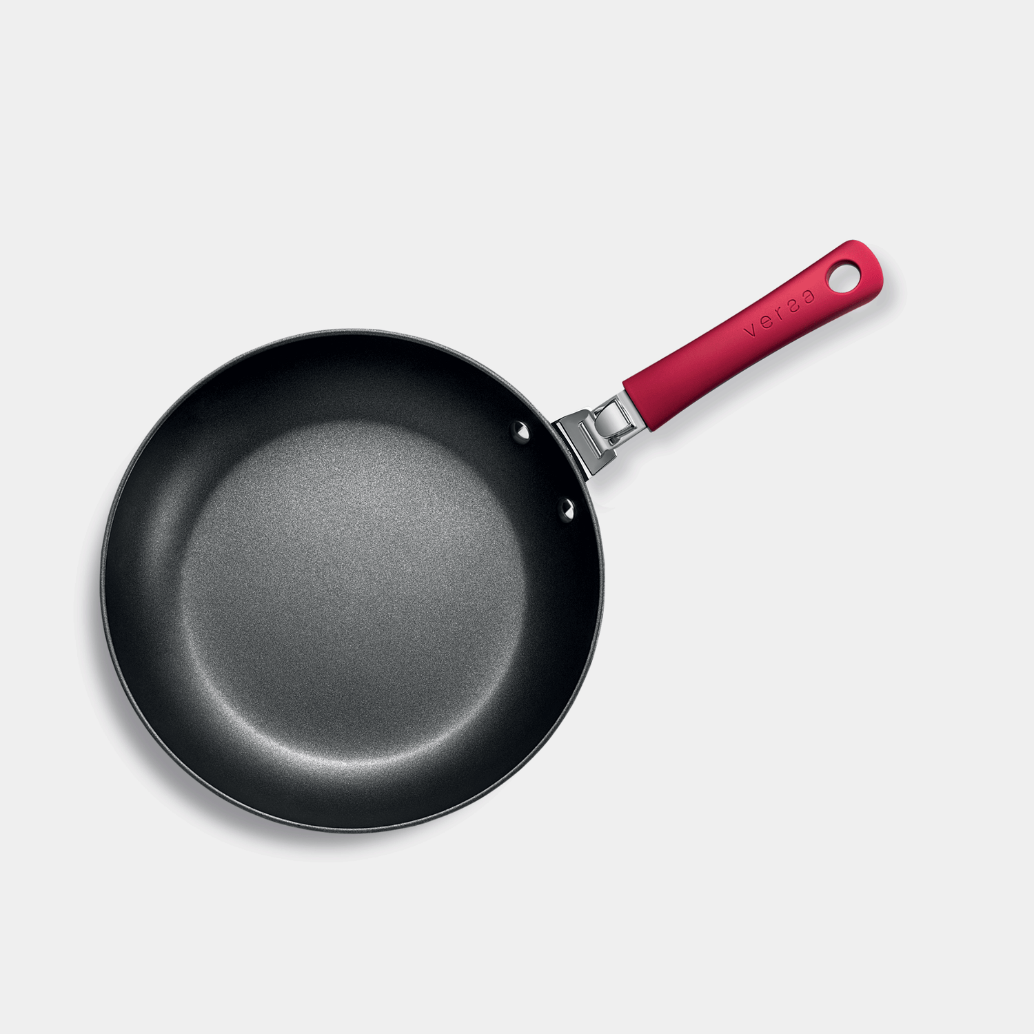 Save money, save time, save space with the Versa Anodized Fry Pan. The Versa fry pan features a detachable handle, allowing for added space on the stove, in the oven, or on the table as a serving dish. The Versa handle's easy release button allows for nested storage and easily clicks in for a secure lock. Pan without handle is oven safe to 450 F. Pan with handle is oven safe to 350 F. 3.2 mm thick hard anodized aluminum for even heating and no hot spots. Nonstick interior coating. Perfectly weighted. Detachable handles made of Bakelite and nickel-plated steel. Available in three convenient sizes and colors. Handles are interchangeable to use on any size pans.