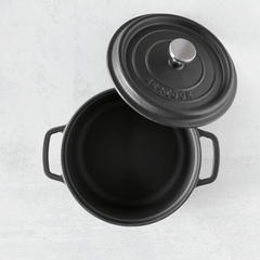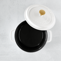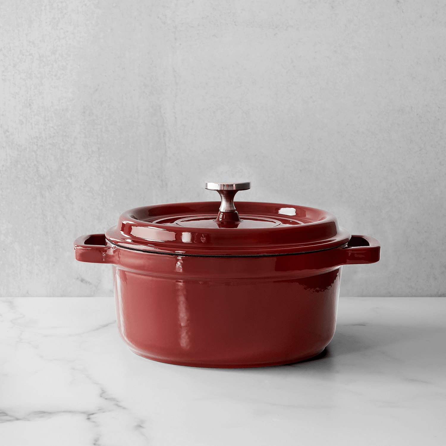 Every cook needs an enameled Dutch oven. It's a versatile workhorse that you can use to braise meats, simmer stews, deep fry, and even bake bread. Ours is cast iron, so it heats evenly, maintains a steady temperature, and can go from stovetop to oven. The durable enameled finish is easier to care for than bare cast iron and cleans up in a jiffy. Easy-grip handles and snug-fitting lid seal the deal. Take your pick from 3 classic colors.