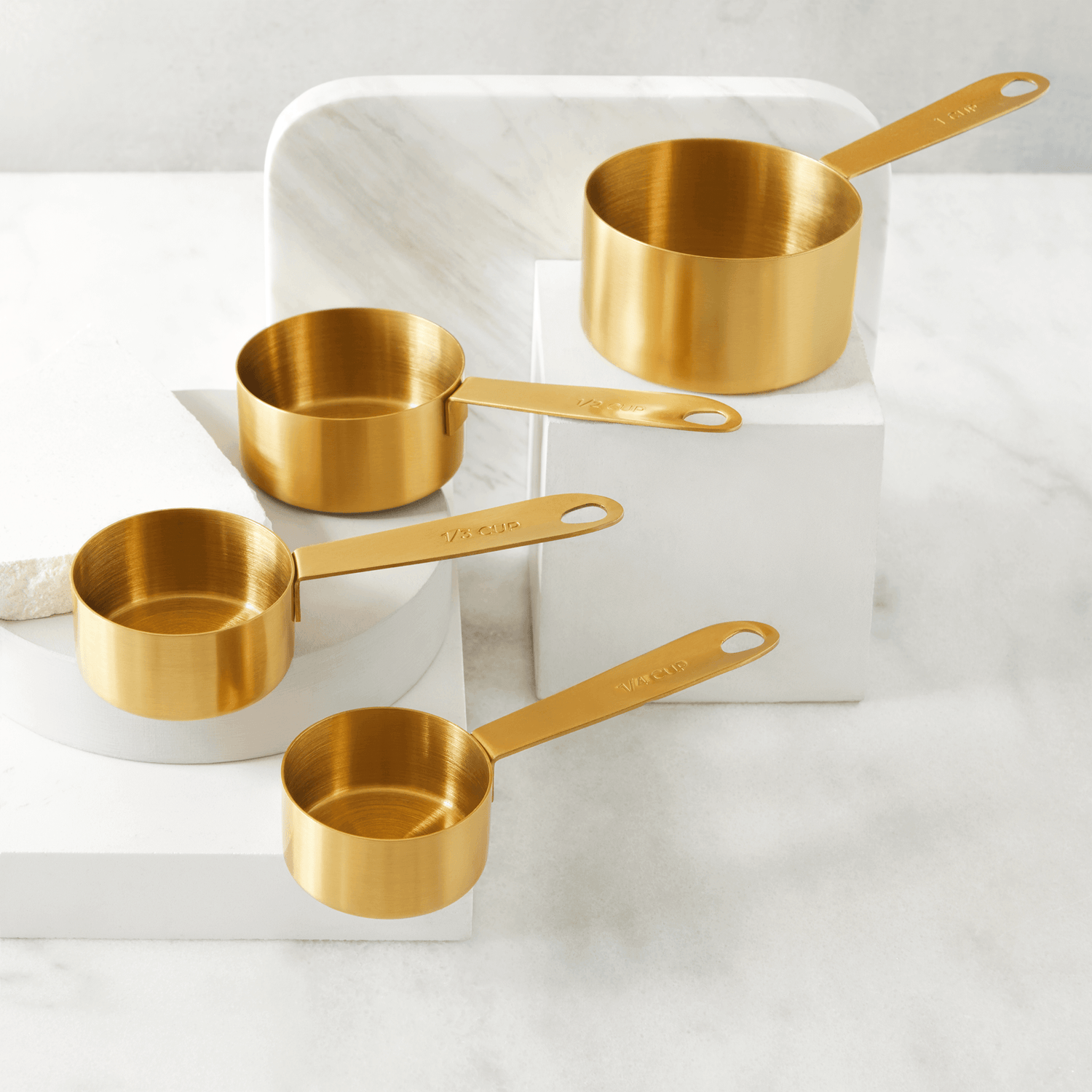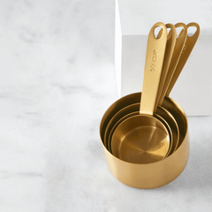 Bring bling to your baking with our brushed gold measuring cups! This set pairs perfectly with our Gold Brush Measuring Spoons. The cups nest for compact storage.
