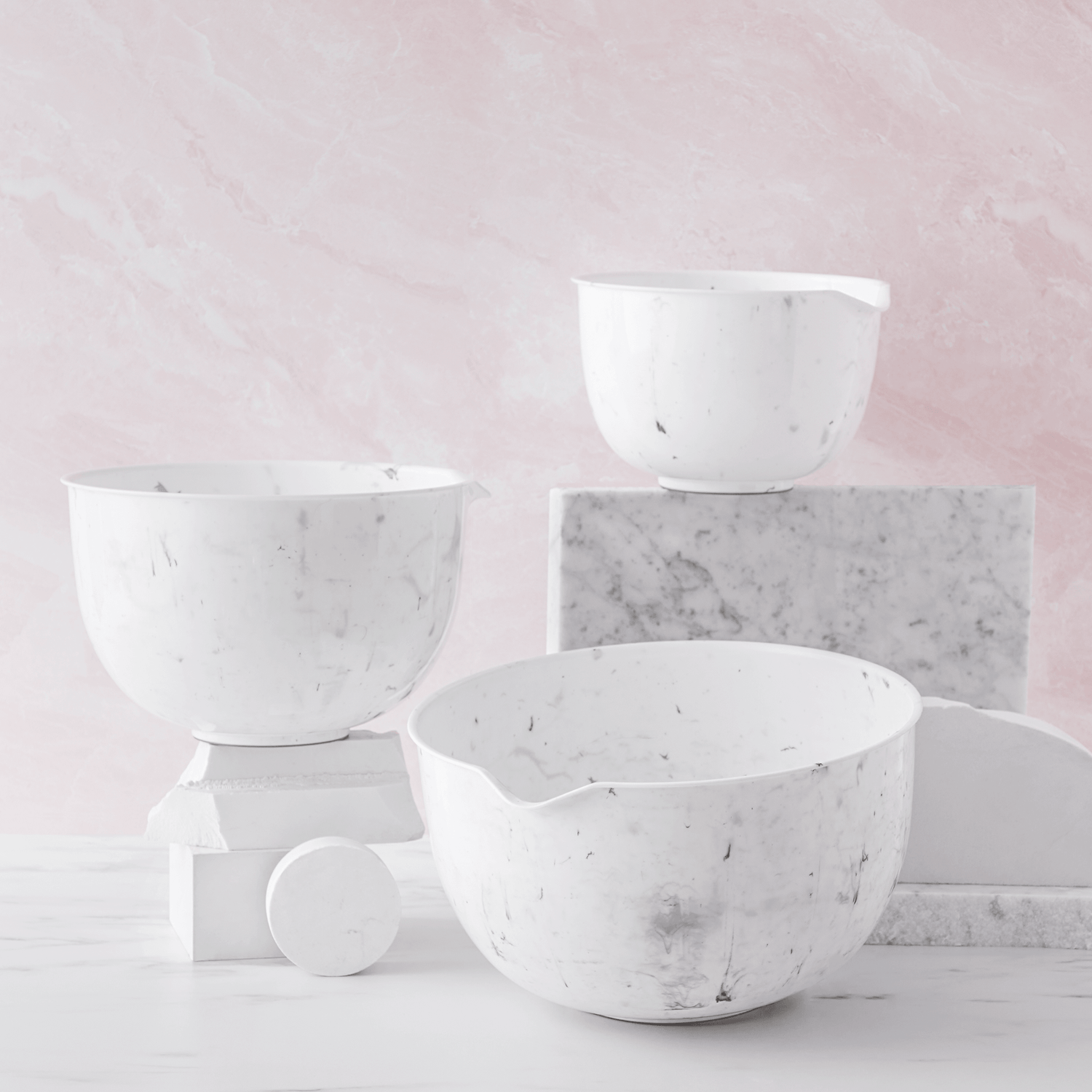 Durable, lightweight mixing bowls are always welcome in our kitchen, especially when they're this thoughtfully designed. The cool marbled pattern is easy on the eyes. The ergonomic handles provide a no-slip grip. And the pouring spouts minimize drips.