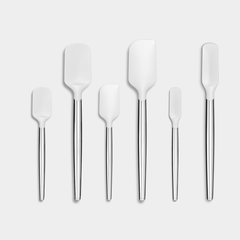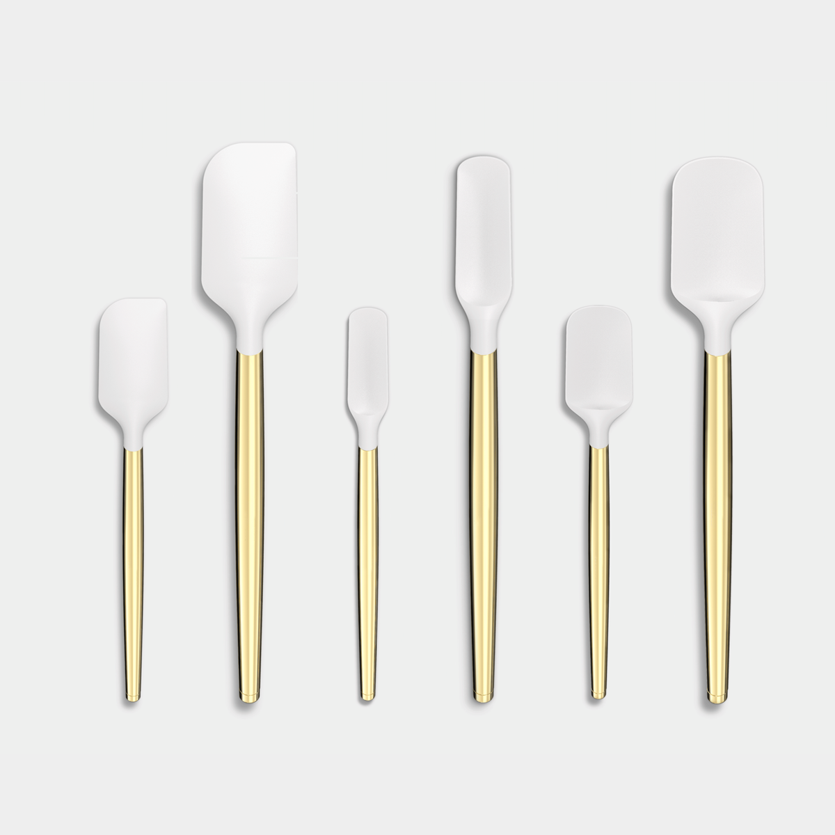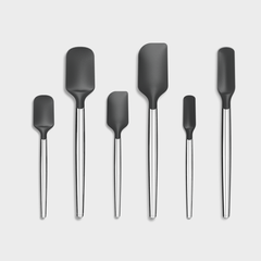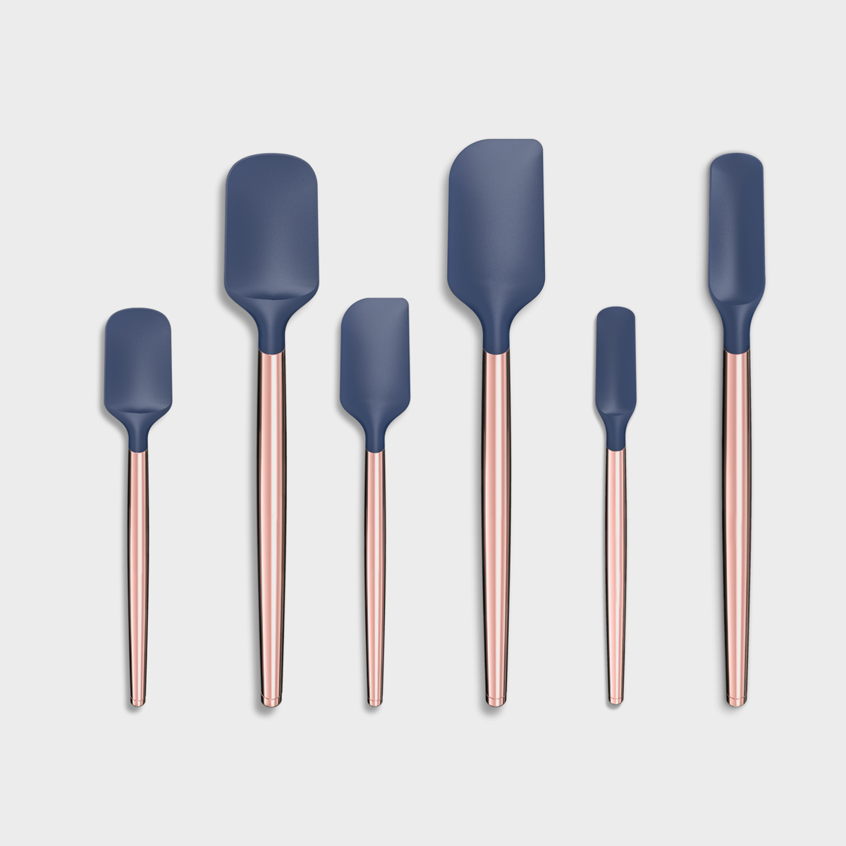 Consistency is boring! Mix and match with spatulas designed to bring different materials, colors and sizes together. Choose your favorite metallic paired with a variety of matching colors. The metallic handle has a nice feel and is easy to grip while you're cooking up your next masterpiece. Silicone heads are designed with different shapes for the various jobs in your kitchen. Included in the set is one spatula, a spoon and a narrow one to reach inside jars to collect the last remnants of your favorite condiments. Function and beauty comes together to making your cooking experience easy, while catering to your personal aesthetic.