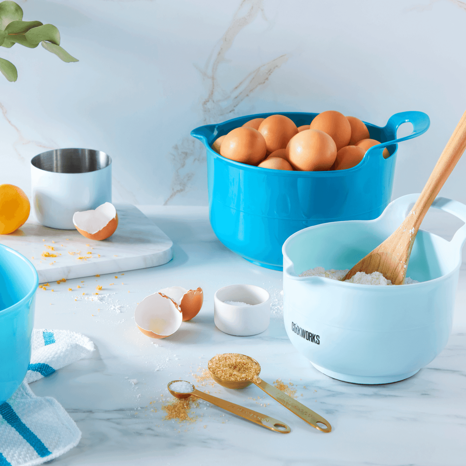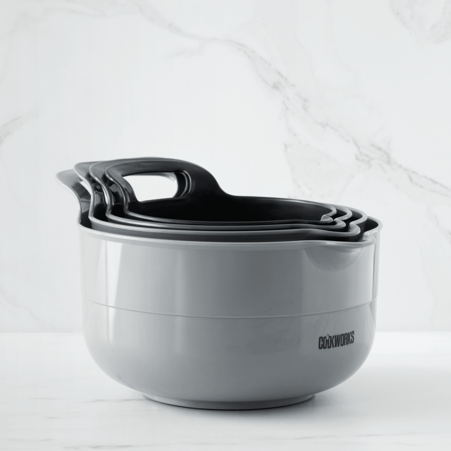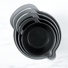 It's always a nice to have a stack of lightweight bowls at the ready in the kitchen. This set includes four sizes, each with a pouring spout and an open handle design.