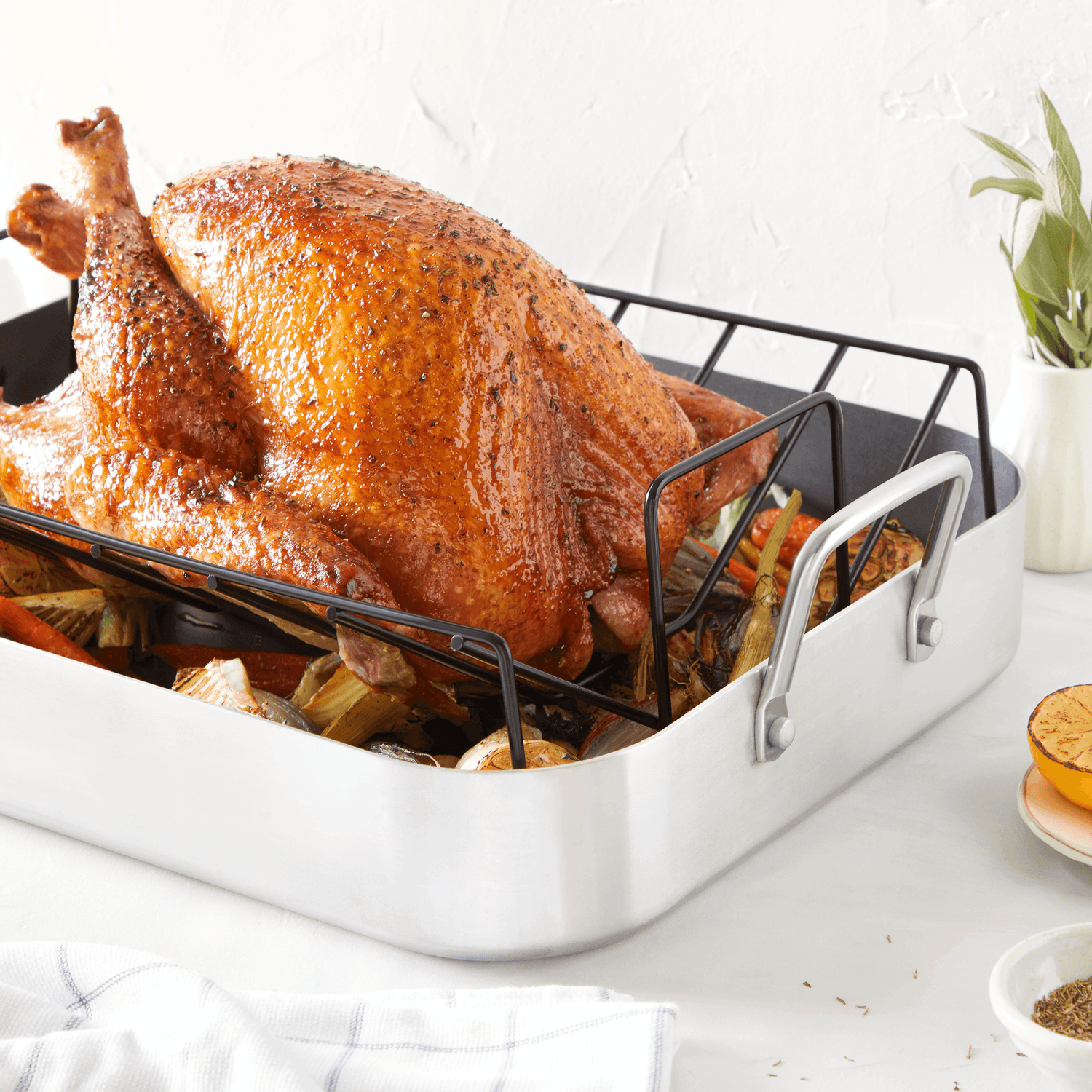 Roasting pan, shmoasting pan. Of course, this big guy will help you roast an award-winning holiday turkey (and gravy), but you can use it for much more than that. Cool a crusty sourdough boule on the nonstick rack. Use it sans rack for big-batch cooking. Did someone say deep-dish lasagna party?