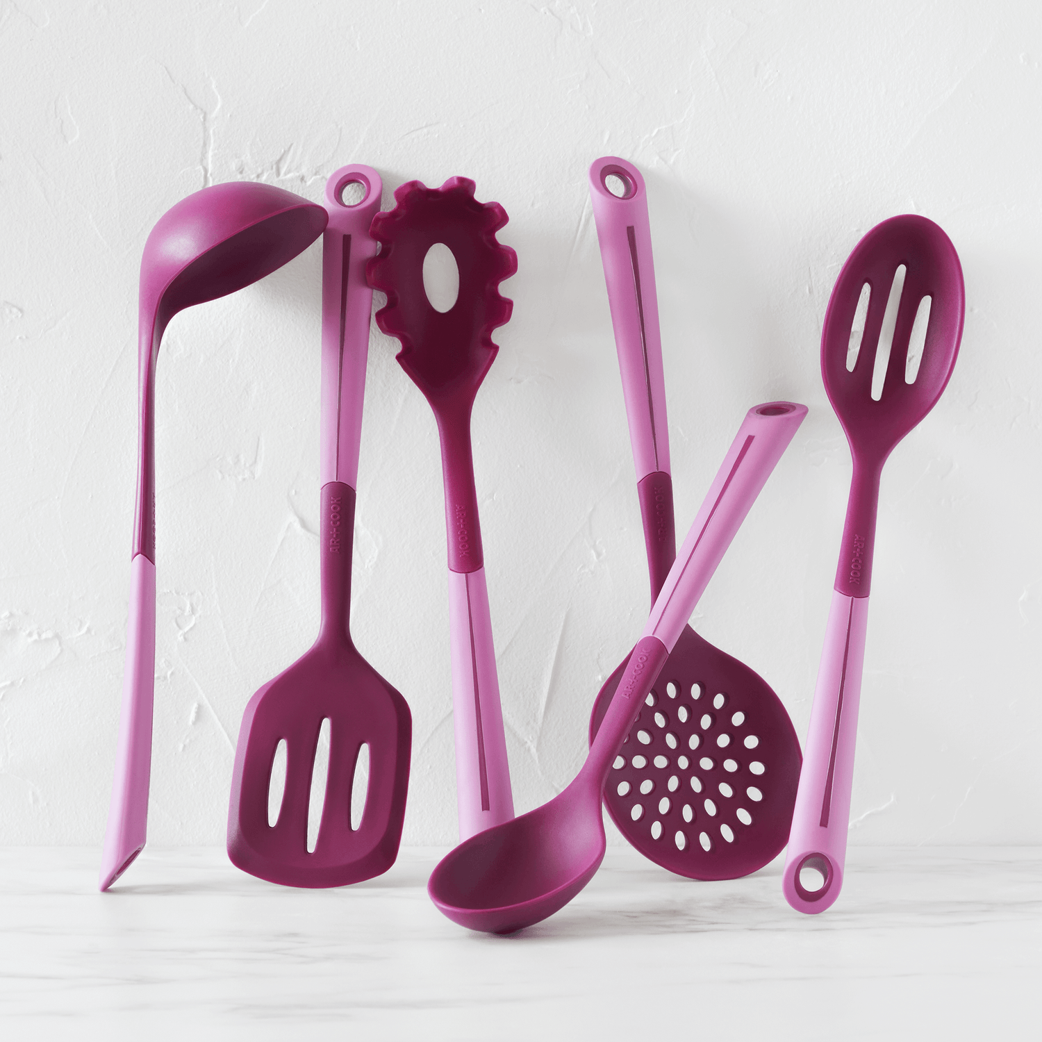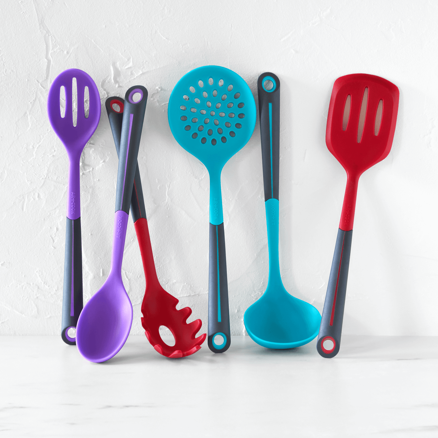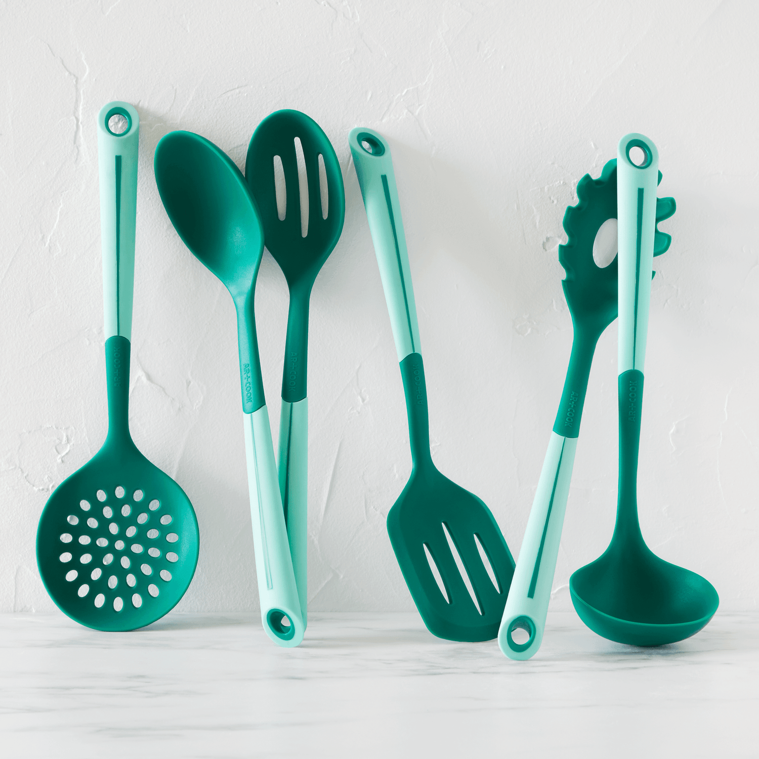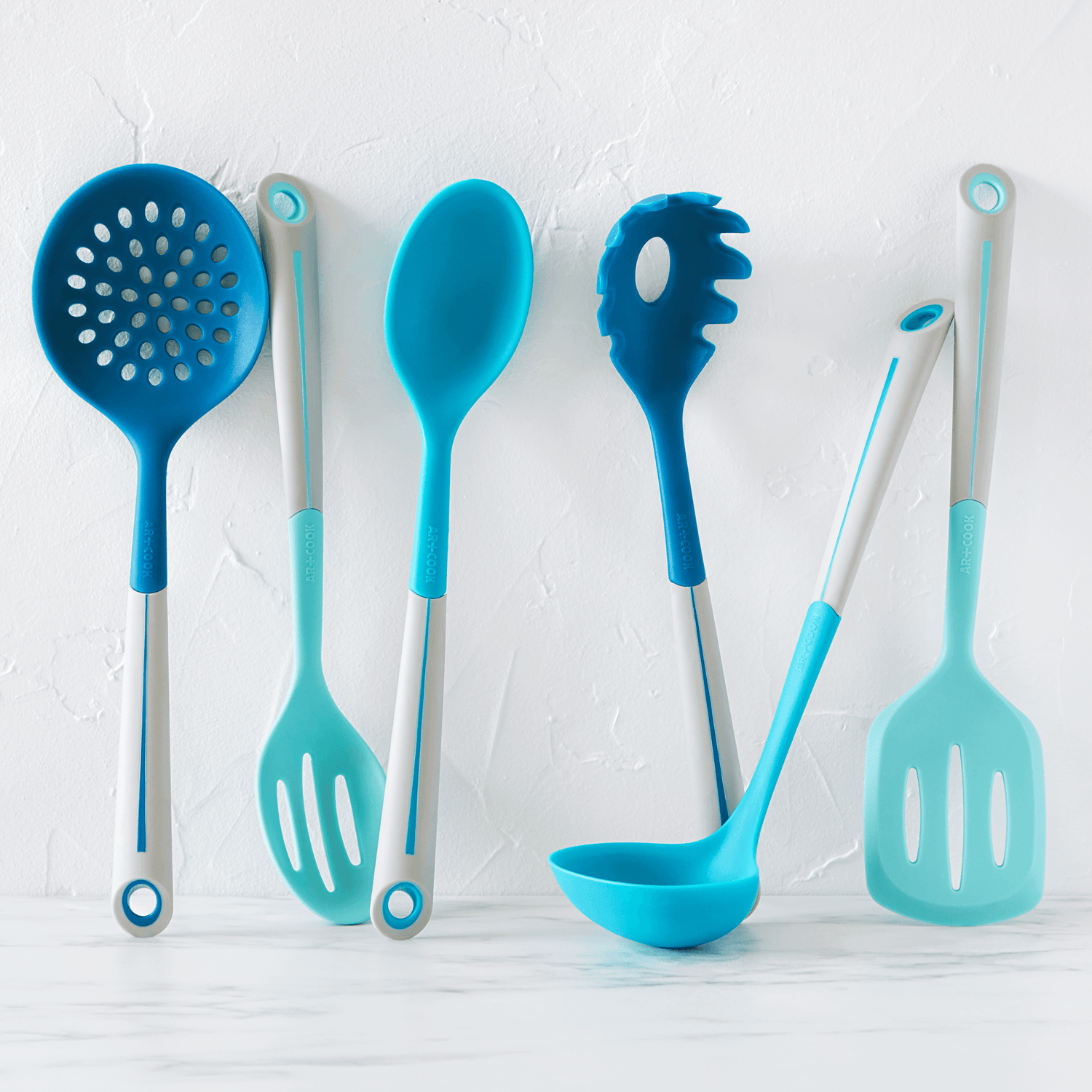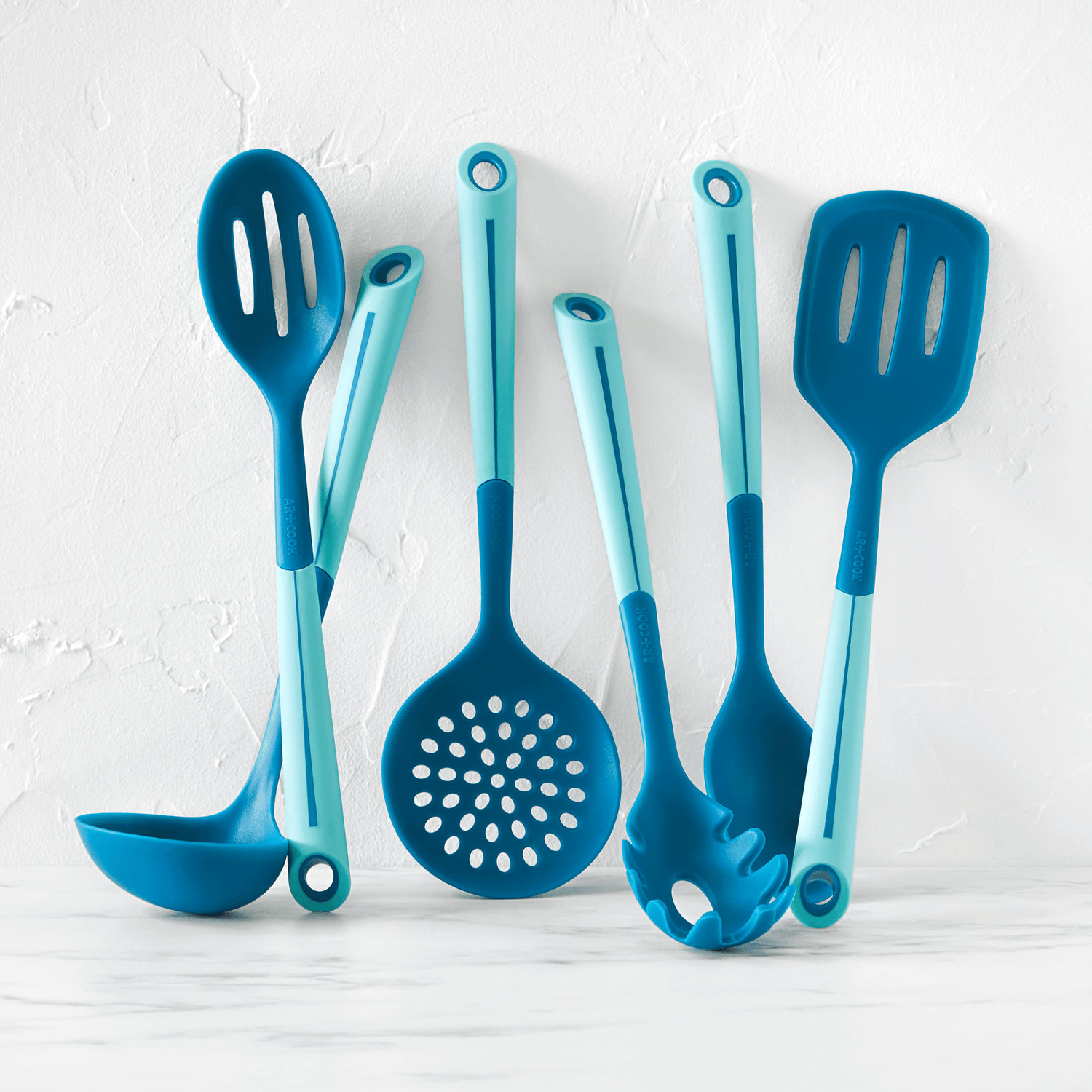 These silicone utensils feature a contemporary design and extraordinary colors. Heat resistant up to 400° F, the silicone head won't scratch your pots and pans. The non-slip handle provides a secure comfortable grip, and the hang hole makes for easy storage. Set includes: Pasta Server, Solid Spoon, Slotted Spoon, Skimmer, Soup Ladle, and Slotted Turner.
