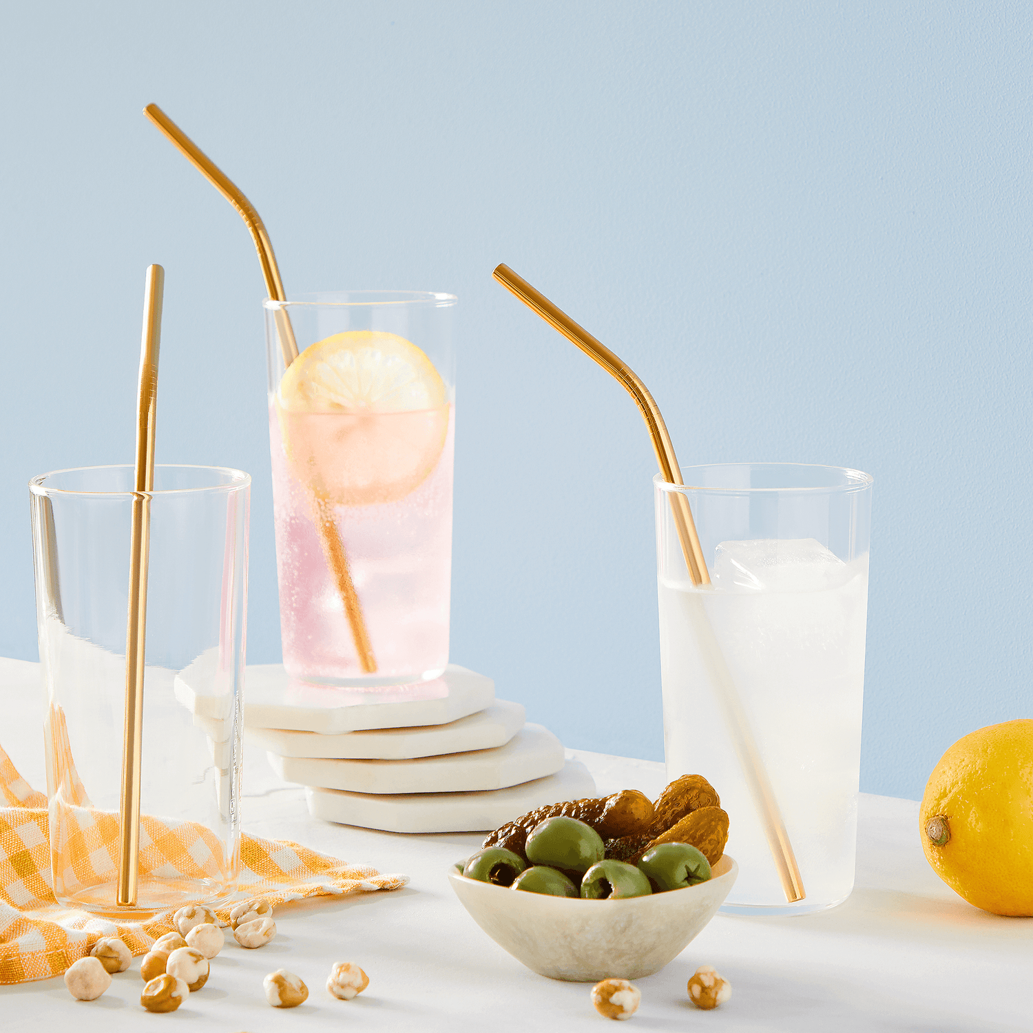Eco-friendly and fashionable, our reusable stainless-steel straws have a metallic finish and are perfect for sipping your morning cold brew. The set includes a mini scrub brush for keeping the interiors squeaky clean. Available in straight or angled.